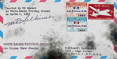In my book Pioneer Rocket Mail & Space Mail, 2019 I wrote about V-2 flown covers: White Sands V-2 * No. 12 * 10.10.1946The 12th V-2 rocket captured by the United States was launched on 10.10.1946 from the White Sands Proving Ground, New Mexico. It reached a height of 173.8 km. Some very few – perhaps only 2 or 3 – covers of the New York collector Robert Schoendorf were also on board during the flight. They had been attached to the outer surface of the rocket and were destroyed when the rocket head drilled into the ground on landing. White Sands V-2 * No. 22 * 01.04.1947 The 22nd V-2 captured by the United States took off from Launch Ramp 33 at the White Sands Proving Ground, New Mexico, on 01.04.1947. The rocket reached a height of 129.2 km. M.D. Silkiner, the Administrative Assistant of the War Department, Ordnance Department, White Sands Proving Ground, sent Robert Schoendorf two flown covers back in an envelope together with an accompanying letter on 02.04.1947. They were burned and damaged on the hard landing. Schoendorf had made vignettes for these covers. Essays of William Sykora's WS-01V vignettes bear the imprint "V-2 Las Cruces, N.M. 1947". Such vignettes already existed for rocket mail transport in 1946. Official envelopes of the War Department, Ordnance Department, White Sands Proving Ground, were not flown – even if they carry both vignett es and the rocket cancellati on and are autographed by Wernher von Braun.