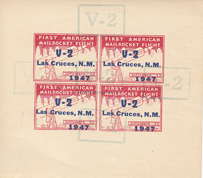 Update: Flown V-2 Rocket Mail News: Concerning this post of flown V-2 rocket mail, it's confirmed that there had been two (2) flown covers on V-2 Flight No. 48 reaching space at 79 miles high on Feb. 17, 1949, from White Sands Proving Ground at Las Cruces, New Mexico. After months of research work on this project, we now have copies of official Army and national museum letters attesting to their official flown status. As time permits, I'll post some of those letters and support documentation here. The two V-2 covers referred to were designated as the "first lot officially recovered from a V-2 rocket after flight" by recovery officer Army Captain Paul Davidson of WSPG's Ordnance Division. Does this statement possibly mean that V-2 Flight #48 were the only two covers to actually fly aboard a V-2 rocket vehicle that had been recovered? It's believed that at least 3 to 4 prior rocket mail covers might had been flown at White Sands on V-2's, however, do any of those covers truly have supporting claim documentation? Having one or more of them being a registered letter on the cover's outside envelope doesn't necessarily mean it had been carried or flown inside a V-2, does it? Did such covers have letters or other documentation attesting to their flown status, or were they just commemorative V-2 philatelic covers? What do other rocket mail collectors think? |
