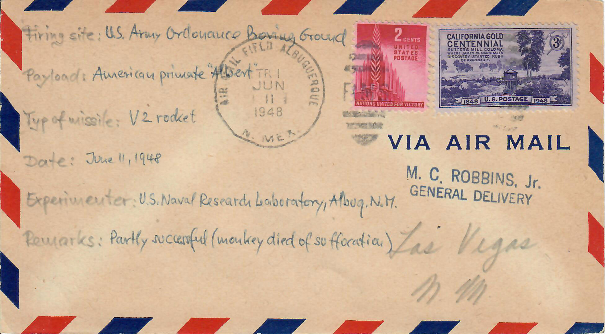 At the latest Heritage auction I acquired a launch cover for V-2 Nr. 37 with the first monkey Albert I from Alamogordo, NM. It was launched on 6/11/1948. Alamogordo, NM is only 57 miles awy from White Sands Missile Range, NM whereas, the distance from Las Cruces, NM to White Sands Missile Range, NM is 124 miles. Obviously this cover is very scarce. Do you think, it might be the only launch cover for this shot?  |