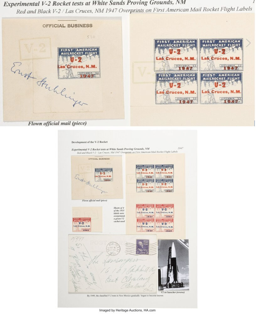 I saw this item that was in the recent Heritage space auction related to the V-2 rocket research at White Sands Proving Ground.The images are from the lot listing. The bottom image is a page from Ben Rankissoon's award winning space cover exhibit which was broken up and sold after his death (per lot description Jacques Bracke owned this page) showing: Individual sheets of red and black "V-2 / Las Cruces, NM / 1947" overprints on First American Mail Rocket Labels; a boxed "V-2" green cachet with one of the labels; a V-2 WSPG photo postcard; and a "Flown offial mail (piece)" autographed by von Braun team member Ernst Stuhlinger. This thread is the only reference I could find to Ernst Stuhlinger and flown V-2 covers. The exhibit page leaves more questions than answers. - What V-2 flight would this piece or pieces be associated with?