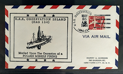Covers from the USS Observation Island are collected by both space and naval collectors but are very reasonably priced. Shown below is a cover sent to the “Prospective Commanding Officer of the USS Observation Island with an invitation to the commissioning ceremony.