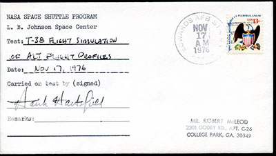 Here's another astronaut flown cover, with this one flown in a T-38 aircraft at Edwards AFB by Hank Hartsfield on a flight to simulate ALT flight profiles.(Hank, if you happen to see this, thanks for being such a great friend to us bothersome collectors for so many years and for your great service to our country).  |