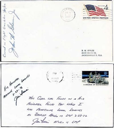 A while back, Ken Havekotte sent me color copies of several of his astronaut flown/carried covers and I'm finally getting around to showing scans of two here. The top cover is from January 1962 and is surely a rare carried cover by John Glenn in a "...Flight Simulator 1/18/62." and nicely signed and documented by Glenn. This was just a month before he became the first American to orbit the earth and surely the simulation he and the cover were involved in were for that historic flight. The bottom cover is a rare helicopter flown cover by Jim Irwin and as noted by him, was flown while he was practicing Lunar landings as the backup Apollo 17 LMP. Irwin added excellent documentation to this cover, twice, and as such, left no doubt that this cover was flown as he indicated. |