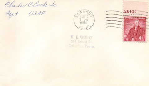 Space Cover #499: Mother Planes - Unsung and Seldom EasyAbove is a rather plain looking cover, postmarked almost 60 years ago on February 13, 1959, at Edwards, CA, and autographed by Captain Charles C. Bock, the chief test pilot for the NB-52A "mother plane" that would eventually launch the X-15 rocket plane and many more. This was the third B-52A bomber that was produced and was heavily modified by North American Aviation in 1958 to become the first X-15 mother plane. The aircraft was delivered to Edwards on November 14, 1958 and underwent a number of flight tests prior to the first X-15 captive flight on March 10, 1959. The cover above was postmarked during the time of those flight tests and autographed by the chief test pilot. Was it postmarked on a test flight date? I have never seen a log of the NB-52A test flights prior to the first captive flight, so I don't know. Has anyone else seen such a log?