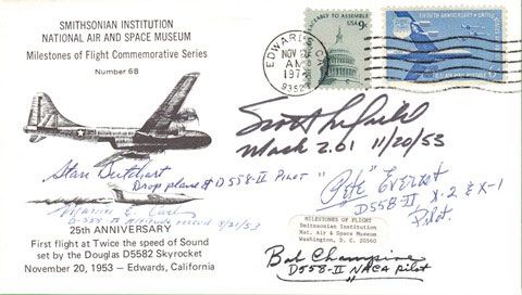 Above is the Smithsonian Milestones of Flight Cover no. 68, commemorating the first ever Mach 2 flight, achieved in the D-558-II Skyrocket rocket plane in 1953, and autographed by a number of Skyrocket pilots. The cachet artwork shows the Skyrocket being dropped from its P2B-1S mother plane, and in the middle of the artwork is the autograph of Stan Butchart who had made flights in both the Skyrocket and its' mother plane.