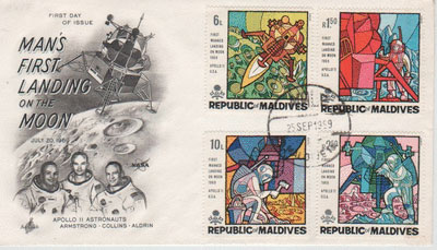 Bob, excellent post, and excellent cover, as usual.Artcraft FDC for Apollo 11 moon landing have a kind of mystery for me. There are thousands of Artcarft FDC with Apollo 11 stamp postmarked with first day mechanical or hand cancel, combo versions by adding to Apollo 11 stamp others US space stamps...and even the Artcraft cover illustration can be found in black color but also in blue color. However, I have seen many others First Day postmarks for Apollo 11 stamps issued by other countries or postal administrations using as basis the same Artcraft cover. Who knows how these kind of covers were produced? Maldives cover is only an example but there are many other Apollo first day from other places different to USA.  |