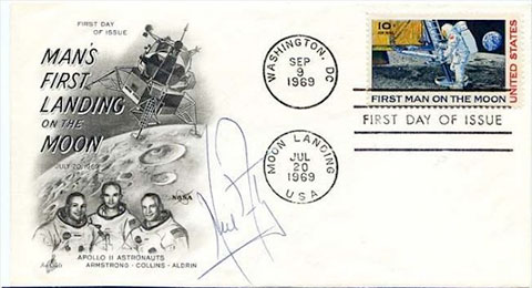 Space Cover of the Week, Week 524 (July 21, 2019) Space Cover #524: Apollo 11 plus 50Exactly 50 years ago yesterday, on July 20, 1969, men from Earth landed and walked on the moon. John Kennedy's challenge to have this country land men on the moon and return them safely to the Earth by the end of the decade was met. And met five more times by December 1972. But as most would agree, Apollo 11 will stand alone as mankind's greatest achievement in space. Previously, Steve, Ken and Eddie have displayed an excellent assortment of Apollo 11 covers. So the challenge for this SCOTW contributor was to find something significant that wasn't already shown. And also I wanted to present just one single cover that would best honor this historic achievement. So I selected one of the Artcraft First Man on the Moon First Day Covers and one autographed by the Apollo 11 astronaut who took that one small step into history. The Artcraft cachet pictures the Apollo 11 crew, with Lunar Module Eagle descending to the lunar surface. Besides the first day of issue date stamp, it also has another date stamp with the date of the moon landing. And best of all, it's affixed with one of the over 150 million Paul Calle-designed "First Man on the Moon" stamps picturing Armstrong taking mankind's first step on the moon. The Artcraft Apollo 11 FDCs are one of my favorite covers and I had always wanted one autographed by Armstrong. Foolishly passing on one for $95 in 1989, a few years ago I found this one available and my dream of having such a cover was realized, but sadly for much more than the bargain cover years before. |