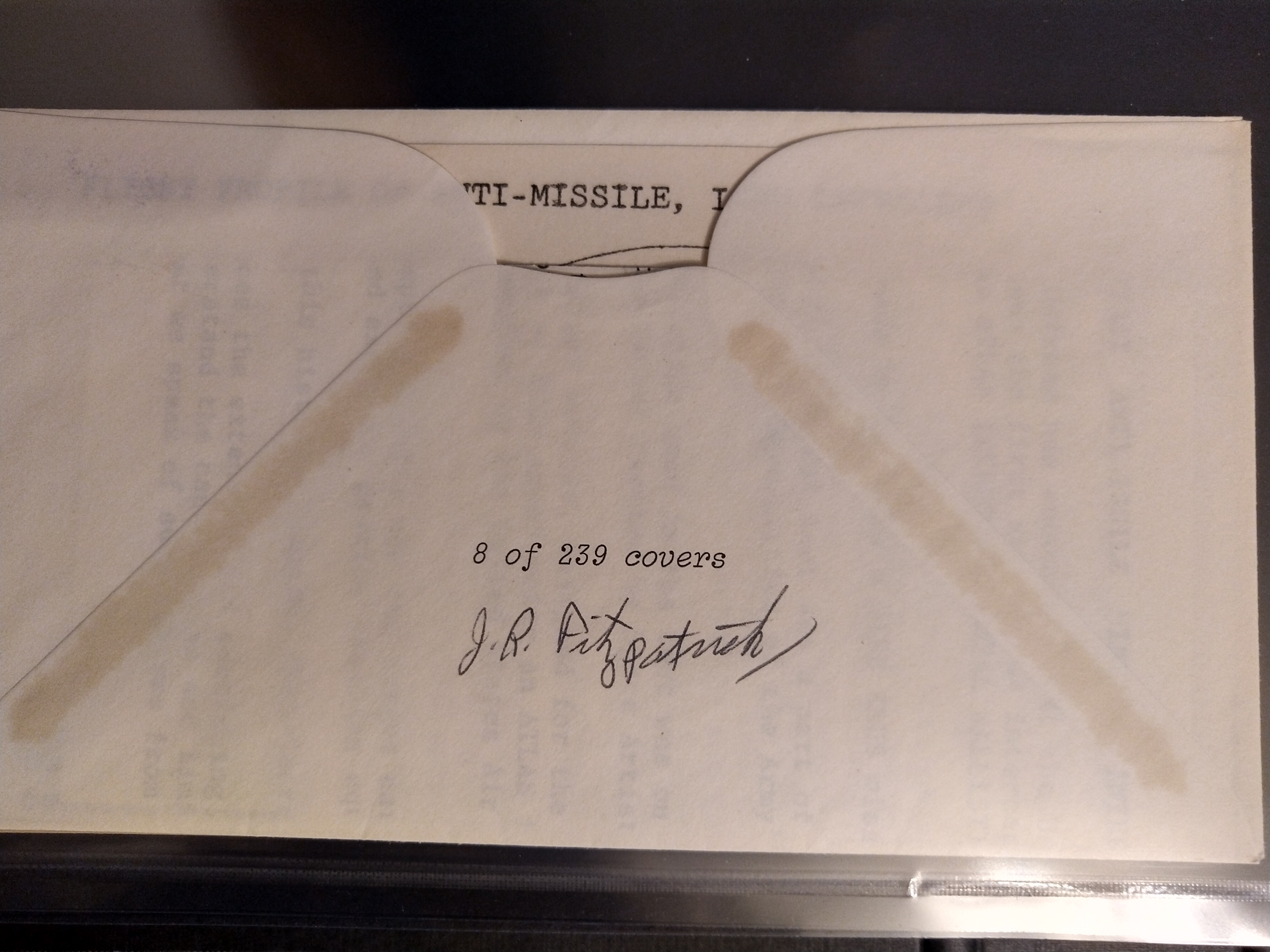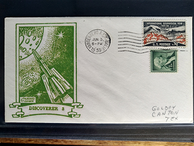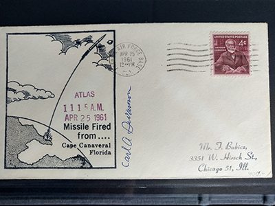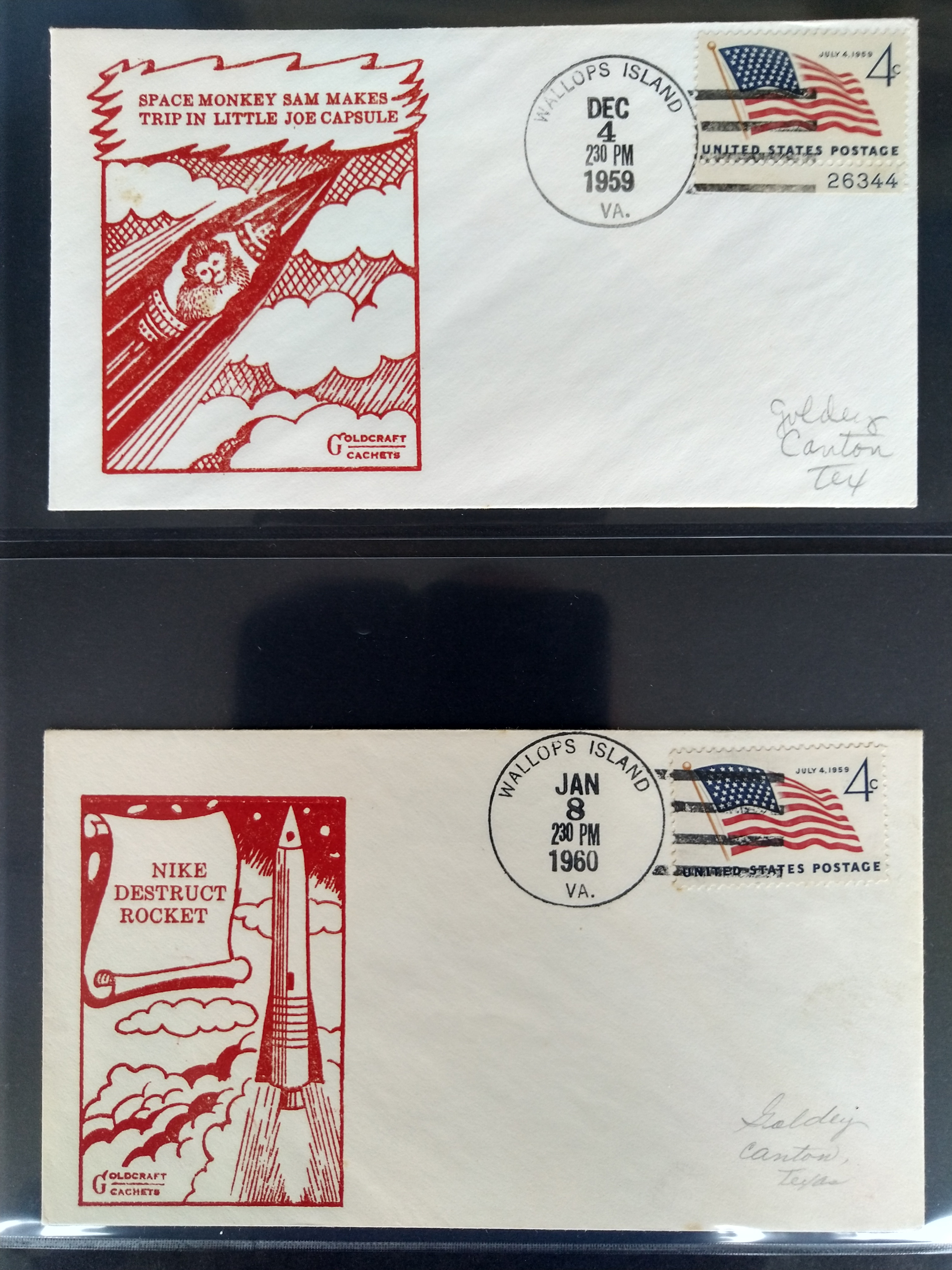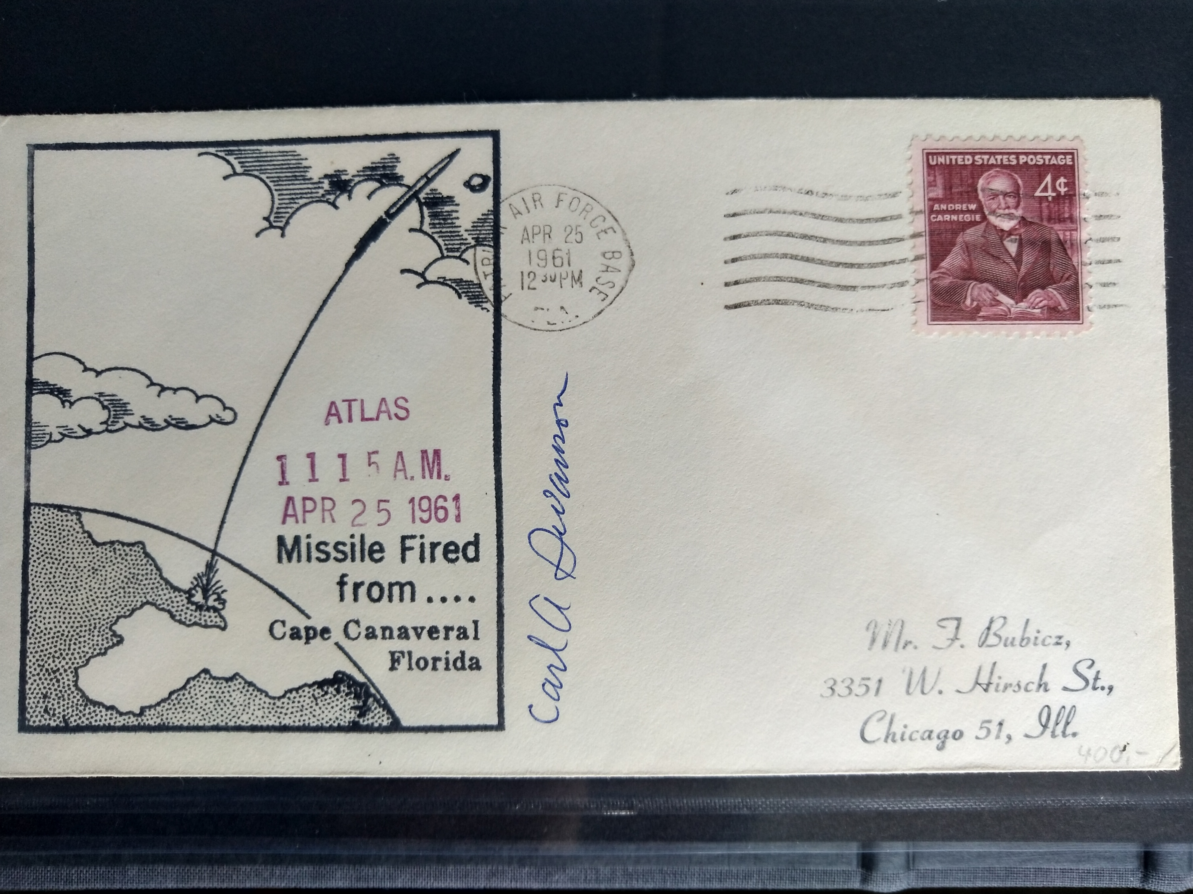 If I had a better word I'd certainly use it. By "cachet maker" I'm trying to imply anybody involved in the business of supplying "launch covers" whether that was the artist, the business owner, the cover servicer or indeed anybody else.I think, almost by default, anybody who does sign a cover was probably quite prominent in the production of that cover. I used "cachet maker" as shorthand for that person. I have responded to your other points separately, below: Swanson and Fitzpatrick; I do have signatures for these, quite a few. All the Joe Fitzpatrick signatures are on the back of limited edition SpaceCraft covers.  My Carl Swanson signatures are on printed SpaceCraft cacheted covers, and as exampled below, on RSC covers. The Rubber Stamp Cachet was 'made' by Swanson, but has nothing to do with SpaceCraft Covers as far as I know.  George Goldey; I think you've misinterpreted what I was trying to say here. (I think we can both agree Goldey was a cachet maker.) I have a number of, mostly very early, Goldcraft covers that were hand addressed in pencil to Goldey, Canton, Texas. They are clearly written in three different hands. I have multiple examples of each, and no other styles. I'm trying (unsuccessfully) to find where I read that his envelopes were addressed by members of his family. I'd be thrilled if anybody could identify any of the styles with a specific person, be that his wife, his children or George Goldey himself.
