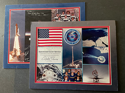 As for covers with a personal connection or a family tie, Eddie, I don't know if the cover and card below would qualify for this topic submission. The VIP launch card for Apollo 17 at bottom left was addressed to myself while at KSC's main VIP viewing site on Dec. 6-7, 1972, when I was a high school senior. There was no writing on back of the card since it was being mailed to myself, but the more I think about it now, maybe I should have made some remarks for such an iconic moment of my "early space connection." But for a more personal connection, note the cover entitled, "Commemorating 100 U.S. Manned Space Launch Viewings (1968-1997)." Our local Florida Today newspaper columnist, Milt Salamon, ran a brief story about my 100th U.S. manned space shot history of launch viewings up-close at the Kennedy Space Center. Starting with Apollo 7 in 1968 and ending with STS-94/Columbia in 1997, I was the second "bird watcher" to have personally witnessed 100 back-to-date or in sequence NASA crewed space launches, mainly from Press Site 39. At the time, only veteran NBC aerospace reporter Jay Barbree had beaten my record. I was No. 2 for many long years! My brother, a graphic designer, actually suggested to me about designing a special cachet cover in celebrating such an unusual occasion along with a NASA space enthusiast friend. I helped approved the cachet artwork and signed-off on the text at bottom, "Space enthusiast Ken Havekotte of Merritt Island, FL, celebrates his 100th U.S. manned space launch viewing with the liftoff of STS-94/Space Shuttle Columbia from NASA's Kennedy Space Center. Havekotte has observed every manned space shot since 1968 as an eyewitness from KSC's "on site" viewing areas, including all 15 Apollo-related liftoffs and all 85 Space shuttle launches." Unfortunately, in setting the record straight, I did eye- witness the early Apollo shots from 7 to 11, however, they were not from the space center itself, but all manned shots afterwards were on center at viewing sites (mostly at Press Site 39 from the mid-1970's onward). Astronaut Don Thomas, a mission specialist that flew on the 85th shuttle spaceflight on STS-94 in July 1997, surprised me with the below mission montage of a flown U.S. flag and mission patch presented to my company, "Congratulations on your 100th manned launch! From NASA and the crew of Columbia, STS-94," a proud moment of my personal and unusual "space-related career." | |