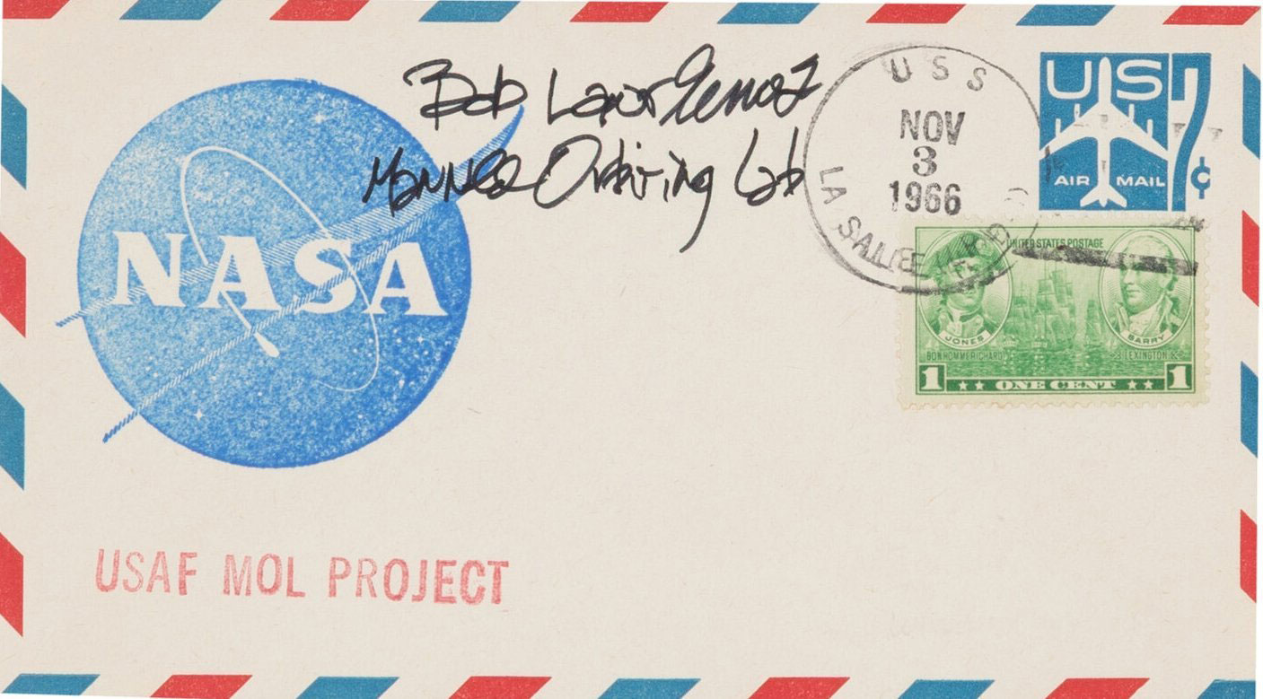 Space Cover of the Week, Week 731 (December 10, 2023) Space Cover 731: MOL and its PilotsThe Manned Orbiting Laboratory (MOL) was part of the United States Air Force (USAF) human spaceflight program in the 1960s. The project was developed from early USAF concepts of crewed space stations as reconnaissance satellites and was a successor to the canceled Boeing X-20 Dyna-Soar military reconnaissance space plane. Plans for the MOL evolved into a single-use laboratory, for which crews would be launched on 30-day missions and return to Earth using a Gemini B spacecraft derived from NASA's Gemini spacecraft and launched with the laboratory. For the space hardware – the MOL program got so far as an actual unmanned test launch on November 3, 1966, aboard a Titan IIIC rocket, the spacecraft completed a suborbital trajectory, successfully testing the circular hatch cut into the heat shield, which was to be the configuration to be used in the MOL program so that the military astronauts could transfer to the attached laboratory module. The capsule splashed down in the South Atlantic Ocean near Ascension Island and was recovered by the USS La Salle. Along with the USS La Salle, two secondary recovery ships – the USS Aucilla and USS Fort Snelling – comprised the recovery fleet. Covers were created for the launch by the main cachet makers of the time – such as Orbit (scanned above), Sarzin, and Space Craft Covers. Covers exist for all the recovery ships but they are hard to find with, interestingly for number of covers I have seen, the USS La Salle being harder to find than the secondary ships. USS Fort Snelling covers typically have a hard to read date in the postmark due to over inking. There are also return to port covers for the USS La Salle (Orbit PrtC and Boudwin RSC). Beware – Charles Riser sold multiple suspect USS La Salle recovery date covers with different cachets and some with suspect autographs. The MOL program was announced to the public on December 10, 1963, as an inhabited platform to demonstrate the utility of putting people in space for military missions; its reconnaissance satellite mission was a secret project. To provide prospective astronauts for the X-15 rocket-powered aircraft, Dyna-Soar and MOL programs, on June 5, 1961, the USAF created the Aerospace Research Pilot Course at the USAF Experimental Flight Test Pilot School at Edwards Air Force Base. The school was renamed the Aerospace Research Pilot School (ARPS) on October 12, 1961. with the third class receiving instruction on Dyna-Soar as part of the course. The commandant of the ARPS, Colonel Chuck Yeager, advised the selection of astronauts for MOL be restricted to ARPS graduates thus the MOL program did not accept applications for astronauts. A selection board was convened in September 1965, chaired by Major General Jerry Page. On September 15, 1965, the selection criteria for MOL was announced. Candidates had to be: - Qualified military pilots;
