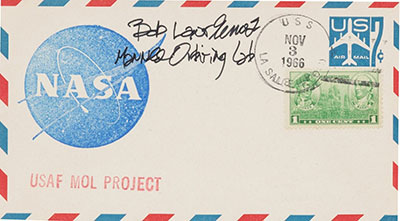 While it's probably impossible to acquire autographs of all 17 MOL astronauts on MOL covers, such as Dennis' Al Crews signed MOL cover, it's probably not quite impossible to acquire all 17 on non-MOL covers.Myself, Tim Preston and his late brother, Bob, among others, were involved in contacting the MOL astronauts thru the mail in the 1980's and '90's. Addresses for most were known and most were cooperative about signing. Lacking the real possibility of finding MOL astronauts autographs on MOL covers, the next best thing was to have them sign appropriate test aircraft covers and ask them to add that they were a MOL astronaut, as is shown by the two covers here (John L. Finley and Richard Lawyer).  The seven easiest of the 17 MOL astronauts to find an autograph for are the seven NASA Group 7 Astronauts, who have signed countless covers through the years as Shuttle astronauts. Having a Mike Adams autograph, this collector ended up with autographs of 15 of the 17 MOL astronauts, but with no likelihood of the set being completed because of the extreme rarity of James Taylor's autograph and the great scarcity of Robert Lawrence's. In years past Lawrence's autograph would be offered occasionally on dealer's lists (wish I had bought one). So, unlike autographs of the 12 moonwalkers and the 12 X-15 pilots, we can probably agree that a complete set of MOL autographs is very close to impossible - until someone finds a Taylor autograph and a Lawrence autograph surfaces. |