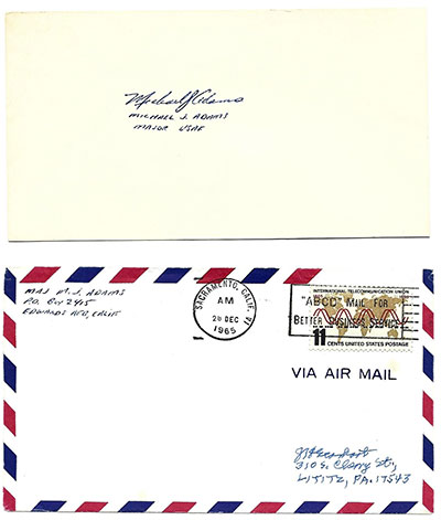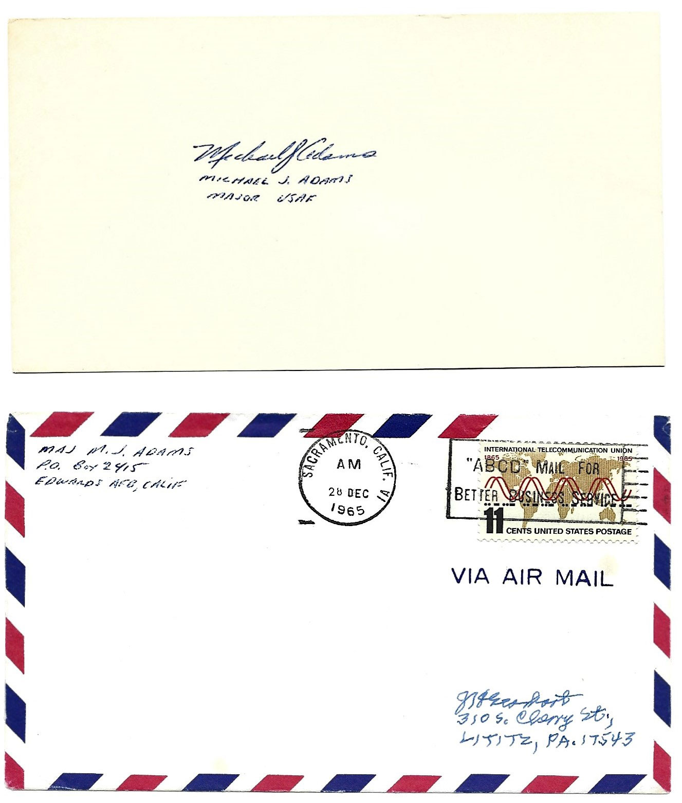 Sorry guys but I can't seem to find the USS La Salle cover that was in my dad's collection. I'm wondering if he sold it as there are a few other rare covers that I know he had but I have been unable to find. I have been through and cataloged just about everything space related in our combined collection. Only took me 6 months! It amounted to 19,600 pieces. I am constantly amazed at what dad was able to compile. This was in the time long before computers. All of the cover requests and autograph requests were hand-written. It truly was his passion!However, this post did give me the chance to fulfill my promise to post the four MOL pilot signatures that are the rarest to come by. All four of these were obtained when we purchased the balance of Space Craft Covers from Joe Fitzpatrick's widow in 1988. Joe was apparently an autograph collector as well as there were hundreds of astronaut signatures included in what we purchased. Joe passed away in 1970 and none of this had seen the light of day until they were sold to us and long before anyone would have started forging these signatures. First is the Mike Adams signature. It is signed on a blank stuffer card. Also shown is the envelope he mailed it in to the collector with the return address written by Adams.  The second set of pictures shows the Russell Rogers, James Taylor and Robert Lawrence signatures. The Taylor is also on a blank stuffer card. I cannot for the life of me explain why the Lawrence signature is on a Gandhi first day cover but there were two of them in Joe's collection. We sold the other one many years ago.  |