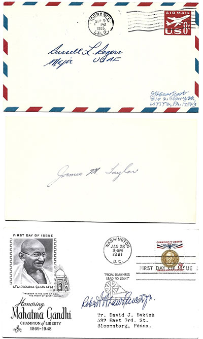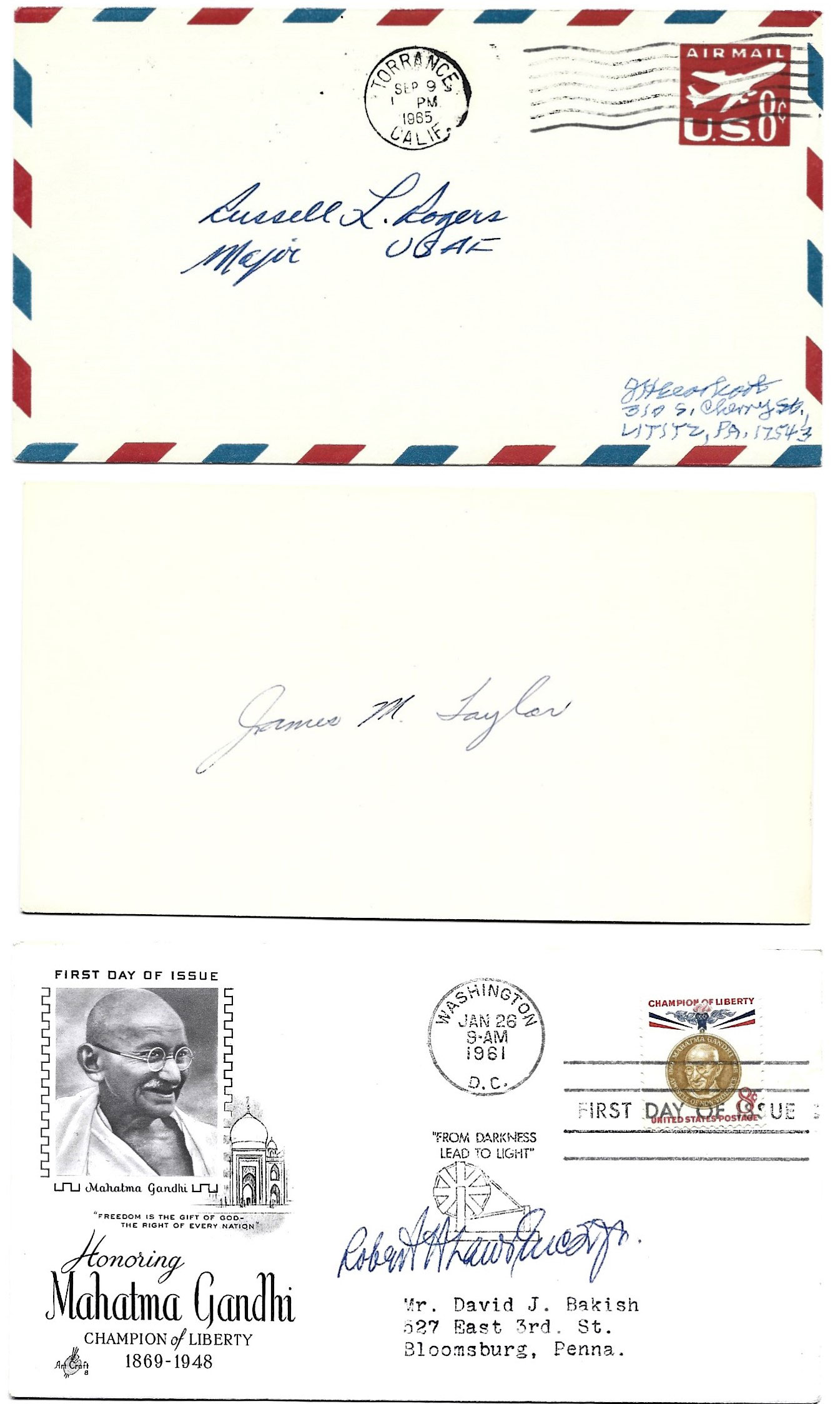 Wow Eddie, you are the only one I know of. Can you post a scan of the Taylor so we can see what his signature looks like?The Adams "return address" sounds great and the Robert Lawrence Ghandi FD - don't know what to say about that one. |