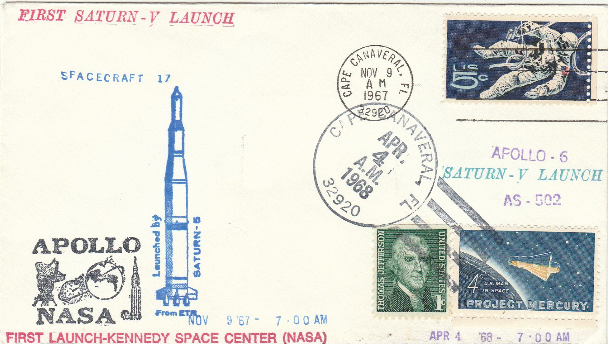 Yes, Alan, Spacecraft 17 (or 017) was the unmanned CSM number designation for AS-501, or better known as Apollo 4, the first Apollo/Saturn V flight vehicle. But that number label doesn't always mean that the spacecraft numbers always fall in order of each other. For instance the second Saturn V launch vehicle flew CSM-020 as AS-502/Apollo 6. Below are a couple more combo-covers regarding Apollo 4, but this time not with both Saturn V's together, but rather events that are 55 years apart; first flight covers of America's two largest but completely different launch vehicle programs launched from the same launch complex 39.  | |
