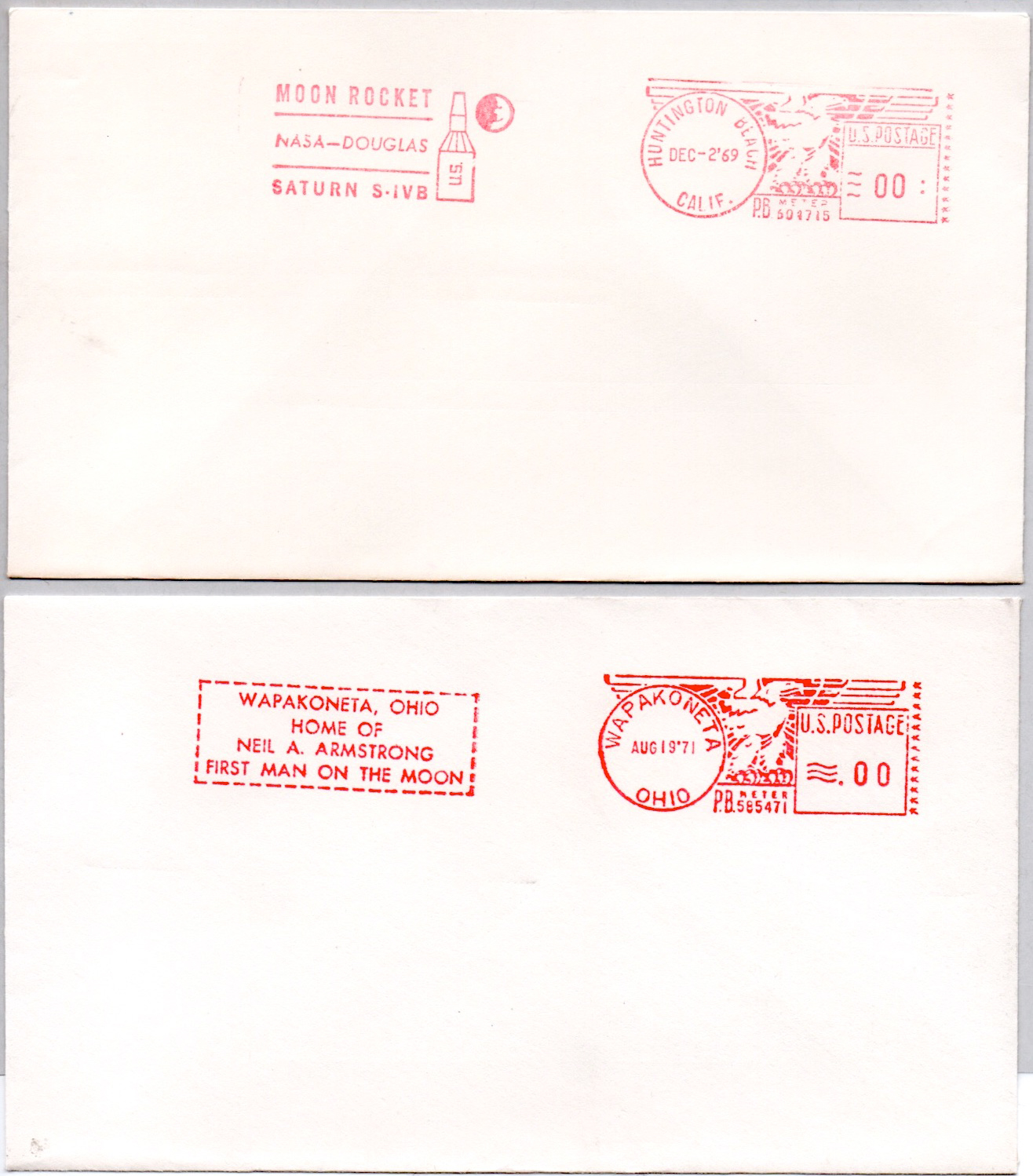 The second envelope features a Douglas Aircraft Company meter cancel from Huntington Beach, CA dated Dec 2 '69 with the slogan "Moon Rocket NASA Douglas Saturn S-IVB" and an image of the top stage of a rocket and the Moon. Douglas was a NASA contractor designing the S-IVB stage of the Saturn IB rocket and Saturn V rockets.