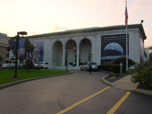 Alan Bean opened his new art exhibit at the Butler Art Institute on Friday night in Youngstown, Ohio with a gala party for invited guests and members of the museum. The show is a retrospective sampling of Captain Bean's paintings from 1982 to the present day and reflects the changes he has made in his style and color palette over the past twenty-three years. My wife and I decided to make a weekend of it and flew to Ohio on Friday. The weather in New England attempted to conspire to delay us in getting to the event, but we made it just in the nick of time. As we arrived at the Butler Art Institute we were greeted with immense banners proclaiming Alan's exhibit. I told Patti to stop the car, so I could snap a picture of the front of the building. Once the car was parked, we walked into the museum and entered the main hall. Alan was there greeting guests in the front of a room filled with his paintings. The museum had surrounded the entire hall with Alan's paintings. Some of his most famous works like "The Fantasy," "In Flight" and the "The Hammer and The Feather" were hanging near it each other as well as other more recent pieces. As we were walking around the room, my wife and I met fellow collector, Roy Gutzke. As the three of us were talking about Alan's work, Mark Gray of Spacecraft Films happened by with his video camera. Soon the four of us were walking around the hall looking at Alan's work. We saw Alan talking with people at the end of the hall and introduced ourselves. We congratulated Alan on his show. Alan was in great form and we talked for a few minutes, but there were a lot of people there and he took the time to talk with everyone. (continued below) |