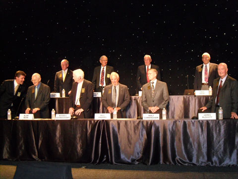 Front row: Moderator Mark Larson (leaning in), Alan Bean, Rusty Schweickart, Bill Anders, Walt Cunningham, Jim McDivitt