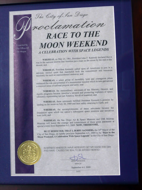 San Diego mayor Jerry Sanders attended the events and made a proclamation declaring September 4th-5th, 2009 to be "Race to the Moon Weekend, A Celebration With Space Legends":