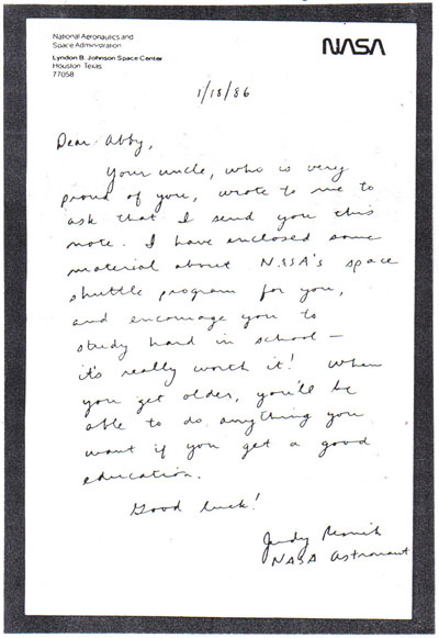 quote:Originally posted by KSCartist: Twenty-five years ago today at my request Judy Resnik wrote and warm hand-written note to my niece encouraging her to "study hard in school. You can do anything you want if you get a good education.