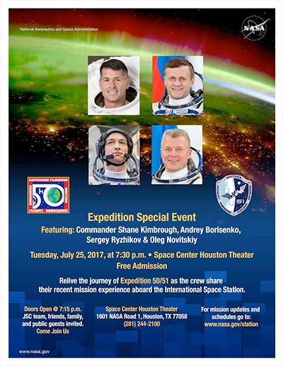 Space Center Houston release Join us for this exclusive opportunity to hear the astronauts of Expeditions 50 and 51 discuss their missions at 7:30 p.m. Tuesday, July 25, 2017 in Space Center Houston Theater. Admission is free and doors open at 7:15 p.m.Find out about the recent experiences of all the crews, including commander Shane Kimbrough, Andrey Borisenko, Oleg Novitskiy and Sergey Ryzhikov. Representing three different space agencies, this group has spent a combined time in space of 1,234 days. This group of space explorers should make your evening cosmically memorable. Don't miss this special event at Space Center Houston!  | |