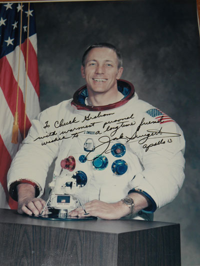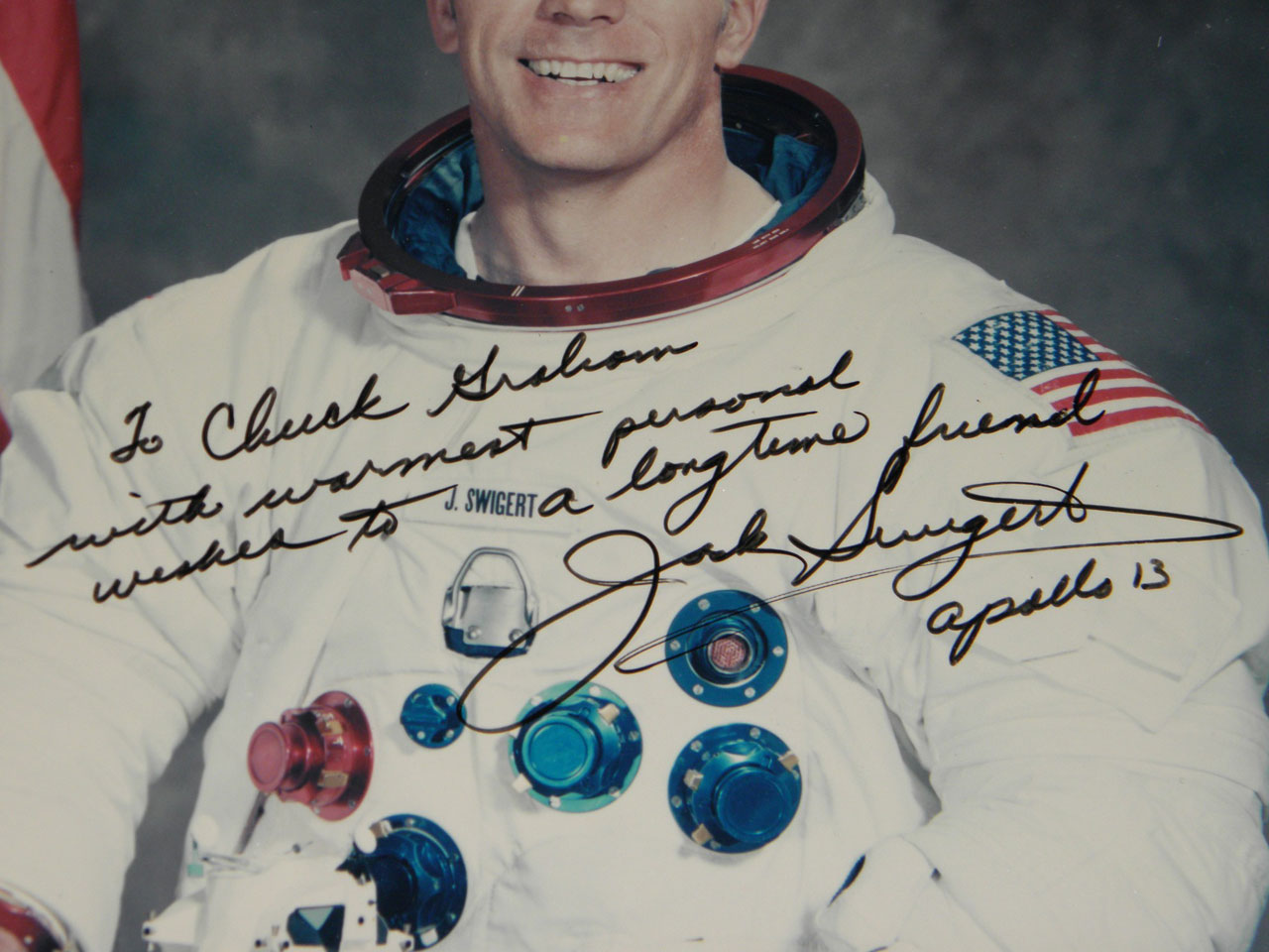 - 8x10 (7 3/8 x 93/4) white edges trimmed of WSS of Jack Swigert on kodak paper. Much more life like detail than the NASA litho which will also come with the photo. It is inscribed - To Chuck Graham with warmest personal wishes to a long time friend Jack Swigert Apollo 13. For all who knows, Chuck Graham provided entertainment for all of the astronauts and was well know and liked. This is from his personal collection.