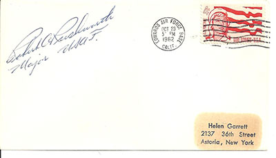 envelope with 4 cent Girl Scouts USA stamp, with Edwards Air Force Base Oct 23 1962 cancellation signed Robert Rushworth Major USAF. Has address label on bottom right hand corner.