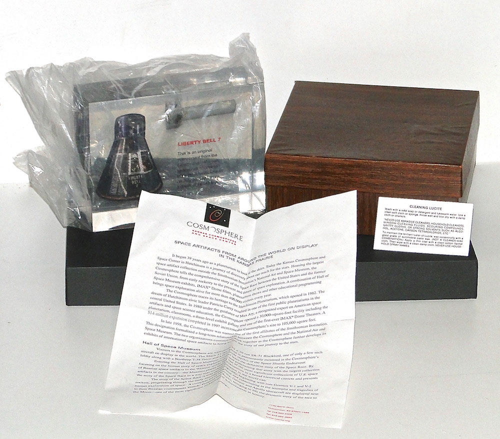Offering my large Kansas Cosmosphere Liberty Bell 7 Large Artifact lucite. Includes original brown box and form letter from the museum. $1850USD Measures 7 inches wide, 5 inches tall and 2 inches thick. Weighs approx 2lbs. Free shipping to USA. Will ship worldwide if tracking offered to your country at cost of shipping (will likely be expensive). I will offer a $40 credit to overseas, which is equal to what free shipping to USA would cost me. Please email me if you have any questions.