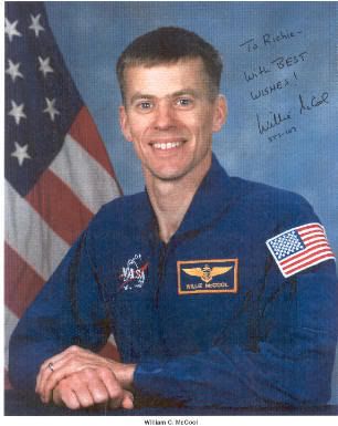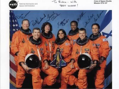 Back in the fall of 2002 I received a STS-107 signed photo when I wrote to each member of the crew. I compared the signatures to autopenned examples I have seen and they neither match those nor do they have the characteristic shakiness that an autopen has. So, I'm certain that they are authentic. Also, I believe the photo was inscribed to me by Willie McCool as the inscription reads "To Richie - With Best Wishes!" and that matches my McCool signed litho in both text and handwriting.I have looked on and off to see what these STS-107 crew photos sell for online but haven't had much luck. I have NO interest in selling it (and I mean 0), but I have always wondered what they go for. If anyone knows I'd be interested in finding out. Also, are McCool inscribed photos hard to find or common? The reason I ask is because the others I have seen images of were inscribed by someone else. For inscription comparison purposes, here is the McCool pic as well. |