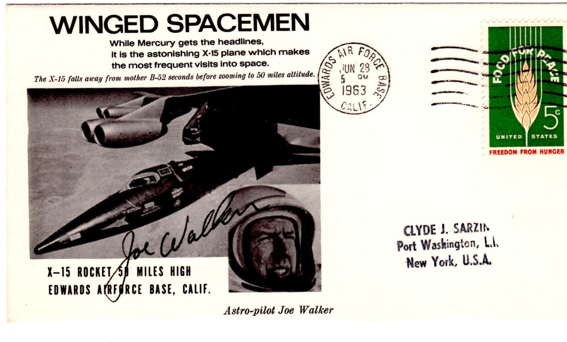 Well, another contributor to cS has recently listed a Joe Walker signed X-15 cover postmarked for Walker's 12/20/62 flight (no cachet, and with a stain) at $200, reduced the price to $150, and just now to $120.I have not bought or sold Walker covers for many years, but remember $200 as the norm for primo covers with his autograph back then. Now, with respect to your cover, the autograph definitely looks good (and it is definitely not Walker's rubber-stamped signature — yes, he had one). The cachet is breathtaking however, Sarzin had these cachets postmarked the day after Rushworth's astronaut-wings X-15 flight, not on the day of one of Walker's flights. So, we have a bit of a quandary on value here. I'd say that $120 for any good Walker autograph, on any piece of paper, would be a bargain. And being on a Sarzin X-15 related cover may help, but not sure about that. Any thoughts from the rest of the forum? |