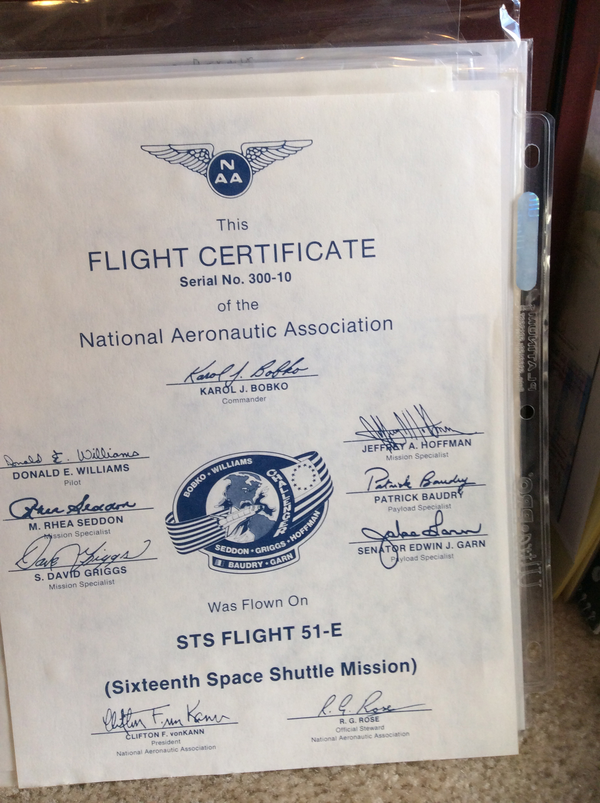 I have a number of certificates from various space shuttle missions. They are beige, and on fine linen paper. They read: "FLIGHT CERTIFICATE" and "Was flown on STS FLIGHT 51-E". They are certificates of appreciation, and are signed (facsimile) by the crews and project managers. I am trying to determine if they are rare, valuable, or if they were actually flown as stated. Thank you for your help and knowledge.  |