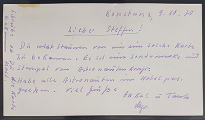 I can readily work out that the picture shows a postman of the Grand Duchy of Mecklenburg-Strelitz circa 1820. It is addressed to a Steffan in Triberg. It has a West German stamp cancelled by a Konstanz XXI Astronautical Congress postmark, but the rest I can only partially understand. On the front (picture side), does the handwriting on the left give a return address, and is it a hotel, and if so which hotel? On the back (correspondence side), can you clean up my feeble attempt at translation? Constance 9th October 1970 Dear Steffan... card... coming. It is... special stamp and stamp of the Astronautical Congress. I have all the astronauts in the hotel... Viel Grosse (big lots) ... Write that you got the card. |