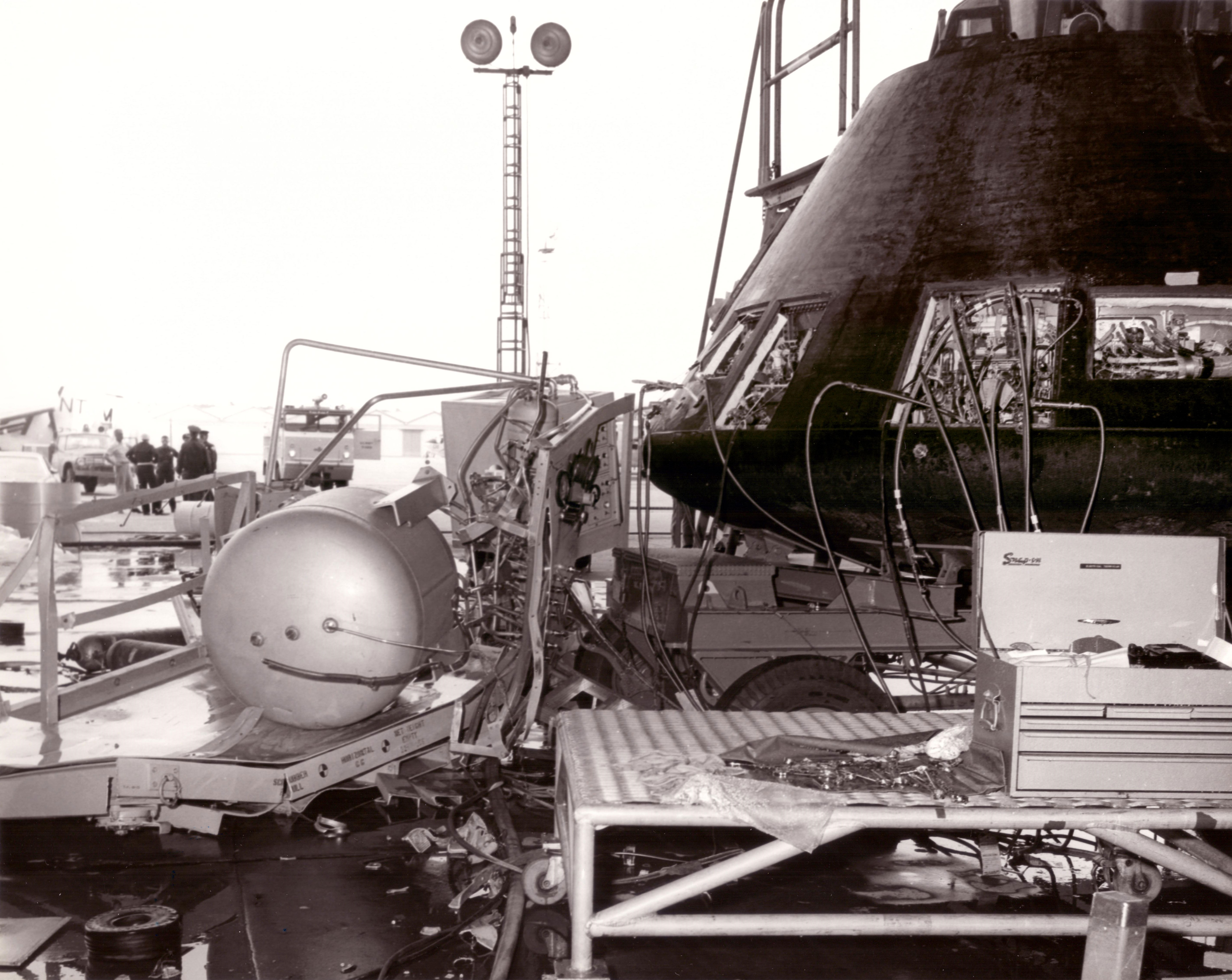 A story about Apollo 16 I had not heard before: Ground service equipment being used to empty the residual toxic reaction control system (RCS) fuel remaining in the Apollo 16 command module tanks post landing exploded in a Naval Air Station hangar near San Diego. A total of 46 people were sent to the hospital for observation, most suffering from inhalation of toxic fumes. Most seriously injured was a technician that suffered a fractured kneecap when the GSE cart overturned on him. A hole was blown in the hangar roof 250 feet above, about 40 windows in the hanger were shattered and the Apollo 16 command module suffered a three inch gash in one of its panels. From the Google newspaper archive, |