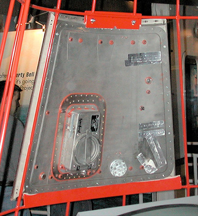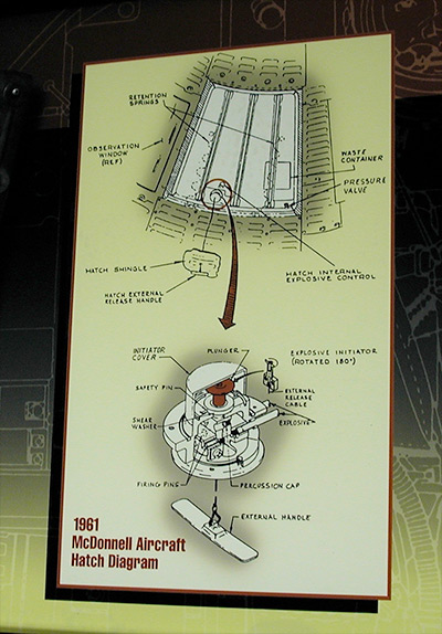 Here are photos of the explosive hatch and plunger, which I took at the Liberty Bell 7 exhibit at the Boston Museum of Science in 2002.