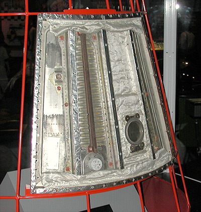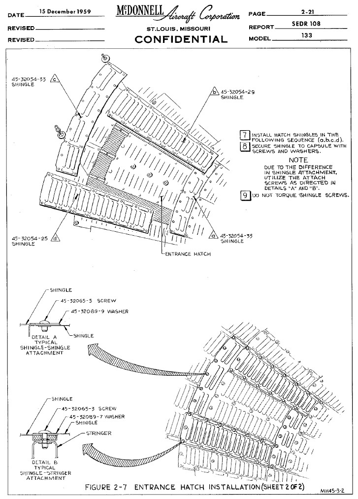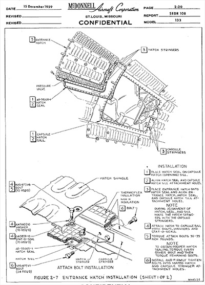 The first photo shows the outside of the hatch, and the second shows the inside. The black exterior shingles were not part of the pressure hatch, and were installed after the hatch was bolted in place. These pages (below) are from the Mercury Maintenance Manual.I don't recall what the large rectangular box was, but it appears to be some sort of experiment that can be exposed to the vacuum on the outside.