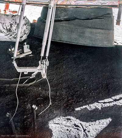 Here I've produced for you, from 16mm film frames (HD source Stephen Slater), an enhanced view from Jim Irwin's window as they approach the landing spot (red dot). The landing buckled the engine skirt.