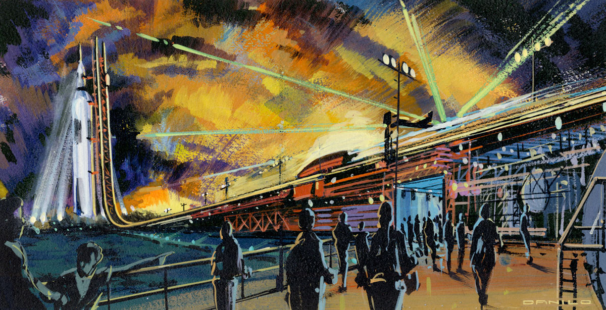 This BRC Imagination Arts' concept art gives the ride, now dubbed the "Vomit Comet," a much more retro, Apollo-inspired look. | |