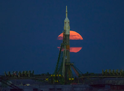The moon, or supermoon, is seen rising behind the Soyuz rocket at the Baikonur Cosmodrome launch pad in Kazakhstan, Monday, Nov. 14, 2016.