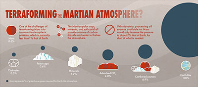 Mars Terraforming Not Possible Using Present-Day TechnologyScience fiction writers have long featured terraforming, the process of creating an Earth-like or habitable environment on another planet, in their stories. Scientists themselves have proposed terraforming to enable the long-term colonization of Mars. A solution common to both groups is to release carbon dioxide gas trapped in the Martian surface to thicken the atmosphere and act as a blanket to warm the planet.