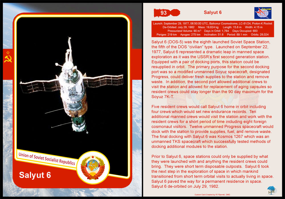 Oh... looks like I left out a word. I will fix it on my master copy. I try and catch the typos but some seem to slip through. Nice catch.Here is the next batch, hope you like them. This gets the set through 1974. #74 Salyut 3  #75 Soyuz 14  #76 Soyuz 15  #77 Soyuz 16  #78 Salyut 4  Thanks for looking!!! |