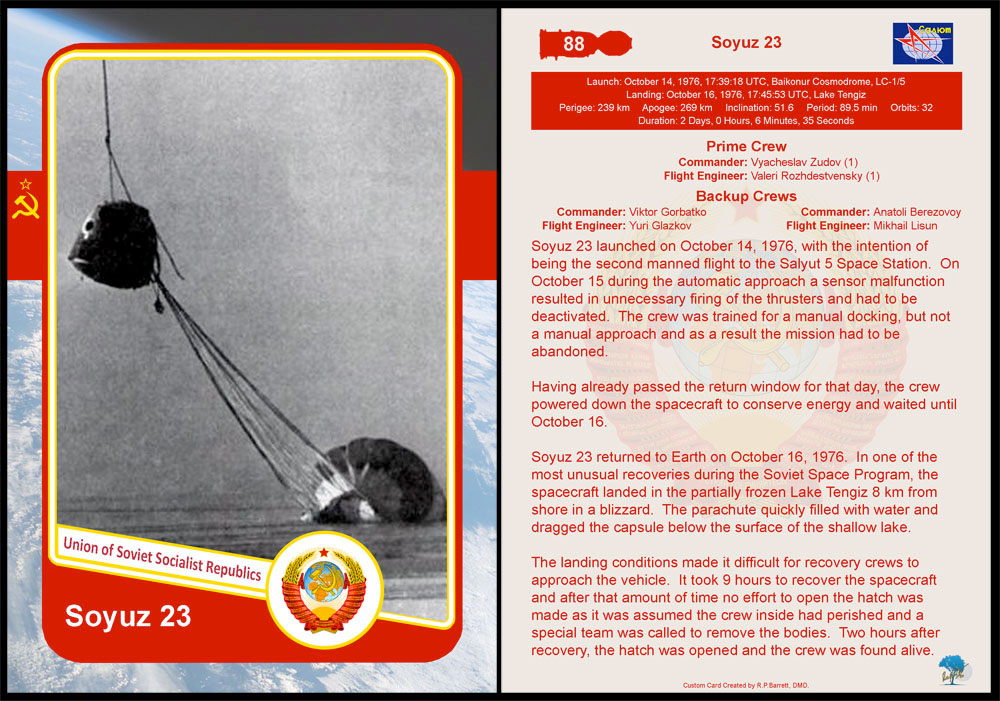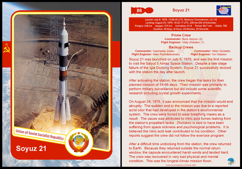 OK, here are the cards for 1976:#85 Salyut 5  #86 Soyuz 21  #87 Soyuz 22  #88 Soyuz 23  |