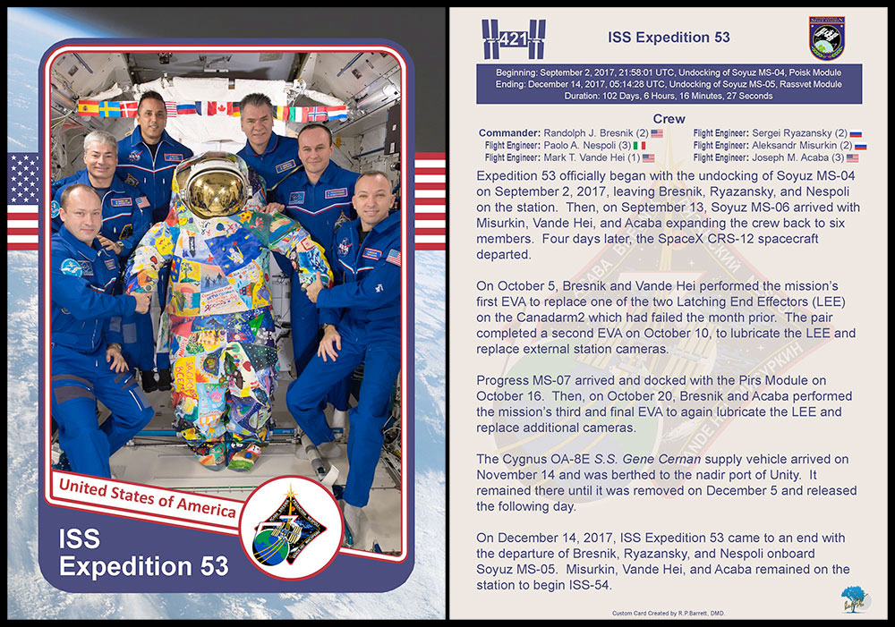 OK, lets get 2017 posted.2017 saw four Soyuz MS missions launch which rotated four ISS crews. During 2017, we saw Russia reduce their ISS presence and we saw Peggy Whitson set a new U.S. career time in space record. Personally, I really like the photo for the ISS-54 card. The crew is spending some relaxing time watching Star Wars. Here are the cards: #417 ISS Expedition 51  #418 Soyuz MS-04  #419 ISS Expedition 52  #420 Soyuz MS-05  #421 ISS Expedition 53  #422 Soyuz MS-06  #423 ISS Expedition 54  #424 Soyuz MS-07  OK, I will post 2018 next! |