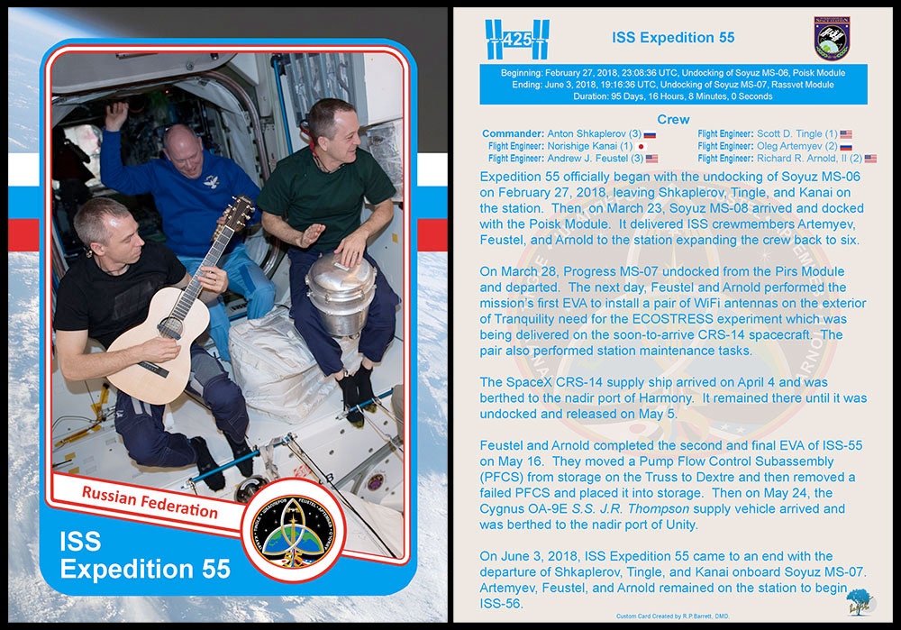 Sorry guys. I have been so busy I just haven't had the time.2018 saw four separate ISS expeditions including the first space mission commanded by a German. The Soyuz MS was launched four times in support of these expeditions but only made it safely to orbit three times. In addition, SpaceShipTwo made its first suborbital flight in 2018. Here is 2018: Personally, I love the "drum" on the ISS-55 card. #425 ISS Expedition 55  #426 Soyuz MS-08  #427 ISS Expedition 56  #428 Soyuz MS-09  #429 ISS Expedition 57  #430 Soyuz MS-10  #431 Soyuz MS-11  #432 SpaceShipTwo Unity VP-03  #433 ISS Expedition 58  2019 will be next! |