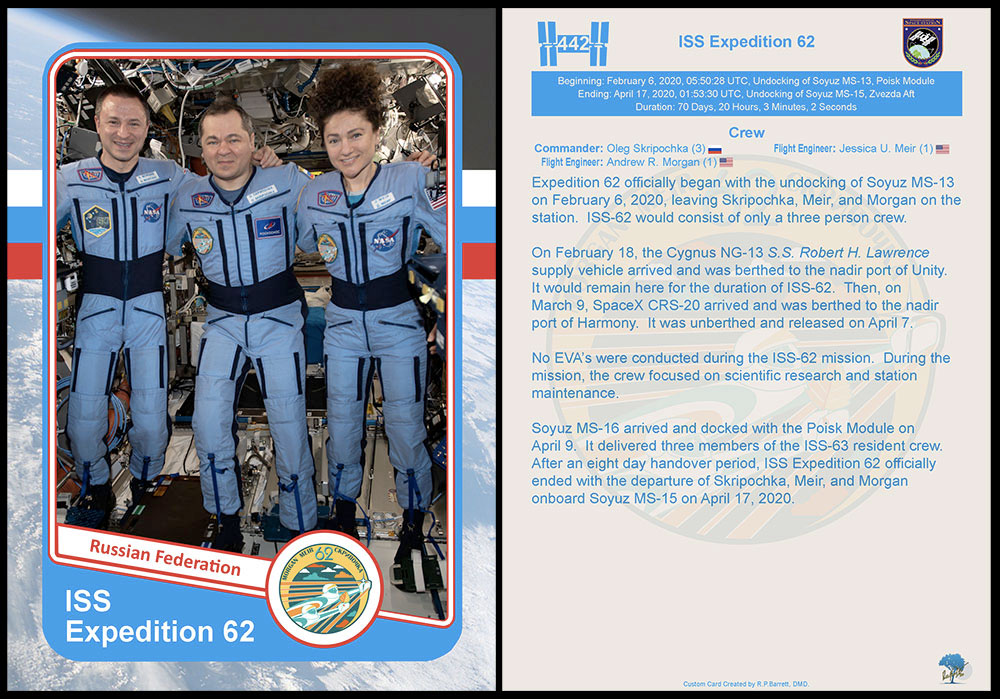 So, with the landing of Soyuz MS-16 last night (or this morning based on where you are), I was able to finish a few more cards for this set. So, here they are:#443 Soyuz MS-16  #444 ISS Expedition 63  #445 SpaceX DM-2  I hope you enjoy them. |
