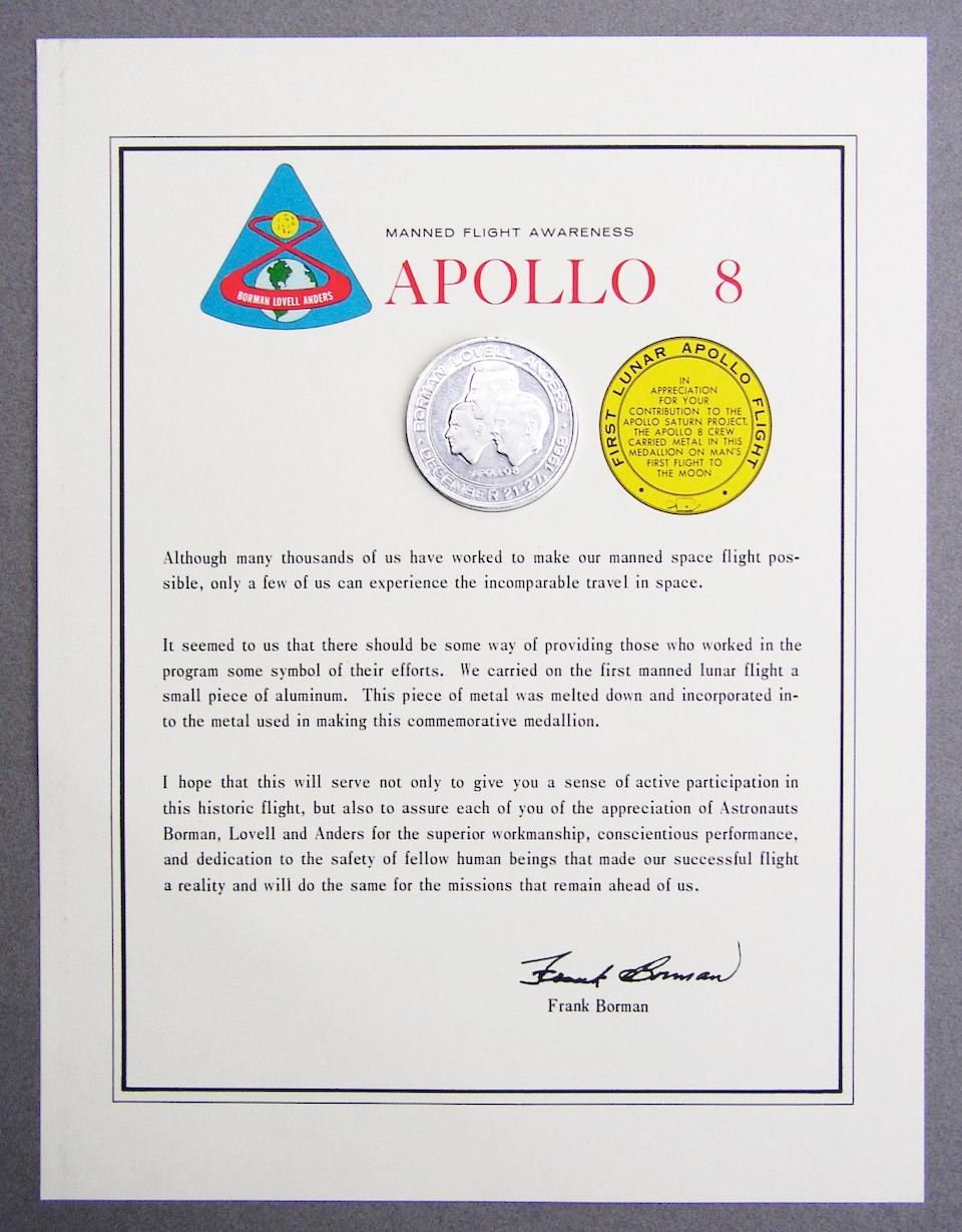 He was in space-themed pajamas when we first met several years ago so an Apollo 8 Manned Flight Awareness Medallion with a quality copy of the original certificate seemed like a good candidate.