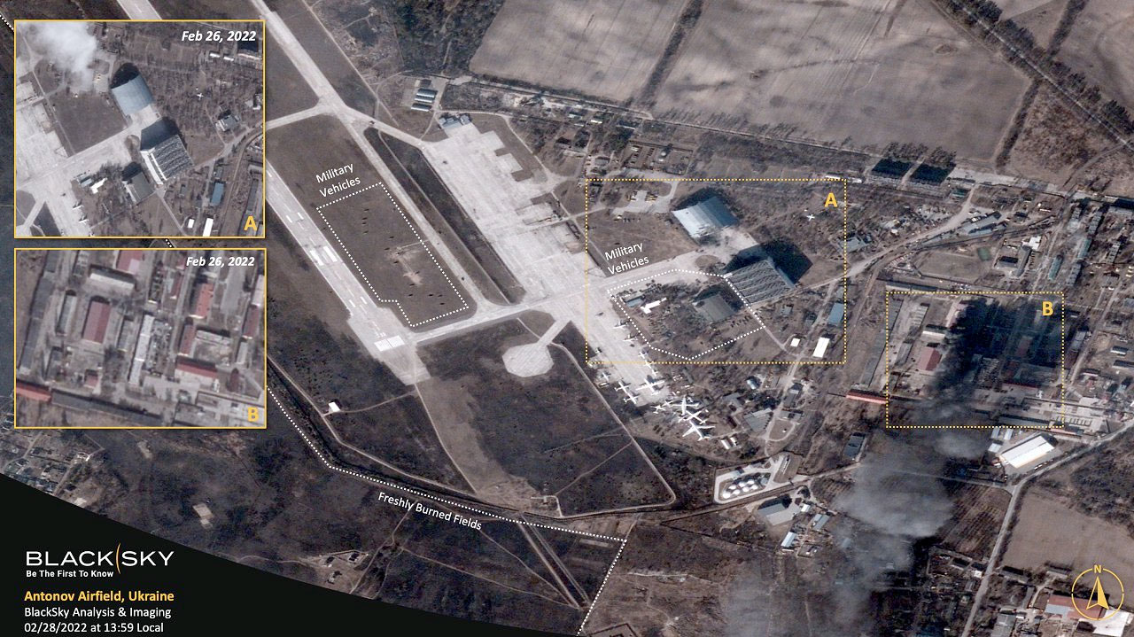From BlackSky, Inc. (via Twitter): Antonov Airfield, Ukraine 13:59 hours local (UTC+2) today. BlackSky rapid revisit and analytics show before and after of destroyed Antonov An-225 Mriya hangar and increased military vehicle presence. Fire at nearby warehouses push plumes of smoke into air as conflict continues.  |
