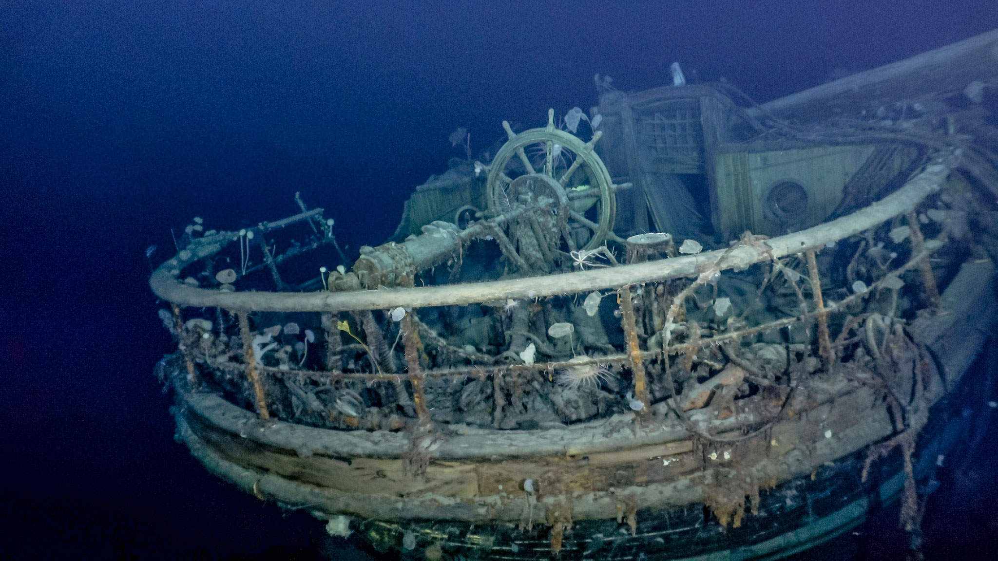 Above: Taffrail and ship’s wheel, aft well deck. (Falklands Maritime Heritage Trust/National Geographic)