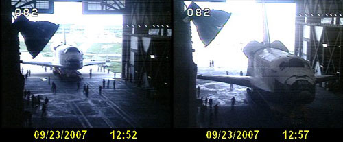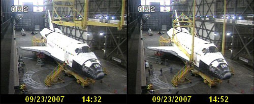 NASA: Testing Complete, Discovery Being Prepped to "Rollover"Testing of space shuttle Discovery’s right-hand main landing gear has been completed. Preparations are under way to roll over Discovery from the Orbiter Processing Facility bay 3 to the Vehicle Assembly Building on Sunday. The "rollover" of the orbiter is one of the prelaunch milestones. Once Discovery is in the Vehicle Assembly Building, it will be attached to its external fuel tank and two solid rocket boosters for its upcoming mission, STS-120, to the International Space Station. The launch of STS-120 is currently targeted for Oct. 23. |