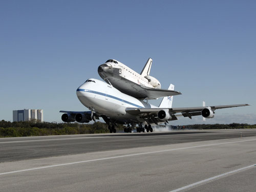 Space shuttle Endeavour, atop the modified Boeing 747 Shuttle Carrier Aircraft (SCA), touched down at NASA's Shuttle Landing Facility at Kennedy Space Center, Florida, at 1:44 p.m. CST on Friday.