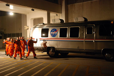 The crew of STS-130 left their quarters and departed for Pad 39A at 12:49 a.m. EST riding on the Astrovan, a modified Airstream trailer. They arrived at their ride to orbit, space shuttle Endeavour, a short 17-minute ride later.