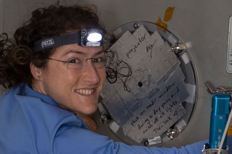 It appears that Alexander Gerst built a makeshift "Earth projector" — essentially a pinhole camera — for use aboard the International Space Station. Spotted in this June 2019 photo with Christina Koch, the device covering the window at the center of the vestibule hatch inside the Harmony module (Node 2) is inscribed in Gerst's hand: Earth Projector — AlexPlace on nadir window during a day pass and switch off all lights. Then look up. Neat! I haven't found a photo or video showing the result, but I imagine the light and colors from the rotating Earth projected on the node's walls.  | |